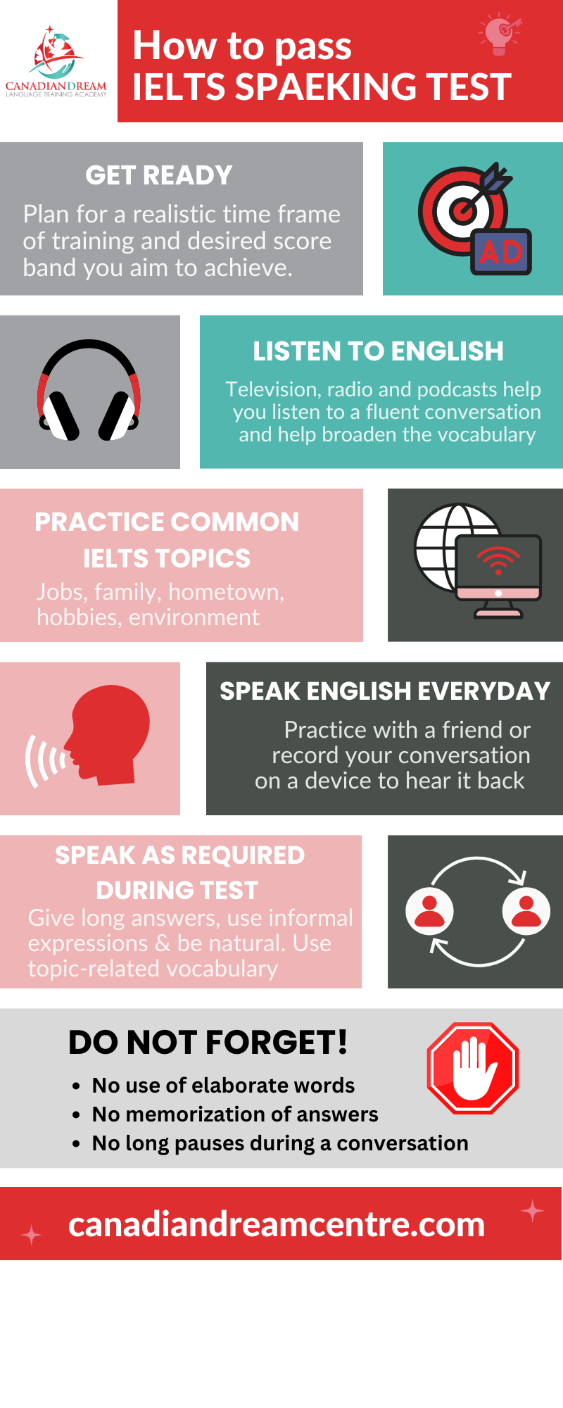 Role & Purpose: I have created an infographic to function as a reference guide that educates the IELTS Test candidate on the IELTS Speaking Test Preparation guidelines, emphasizing the most important instructions that should be considered by the learners to improve their speaking skills for the test. The purpose is to inform and support IELTS candidates by presenting key speaking test strategies in a clear and visual format.