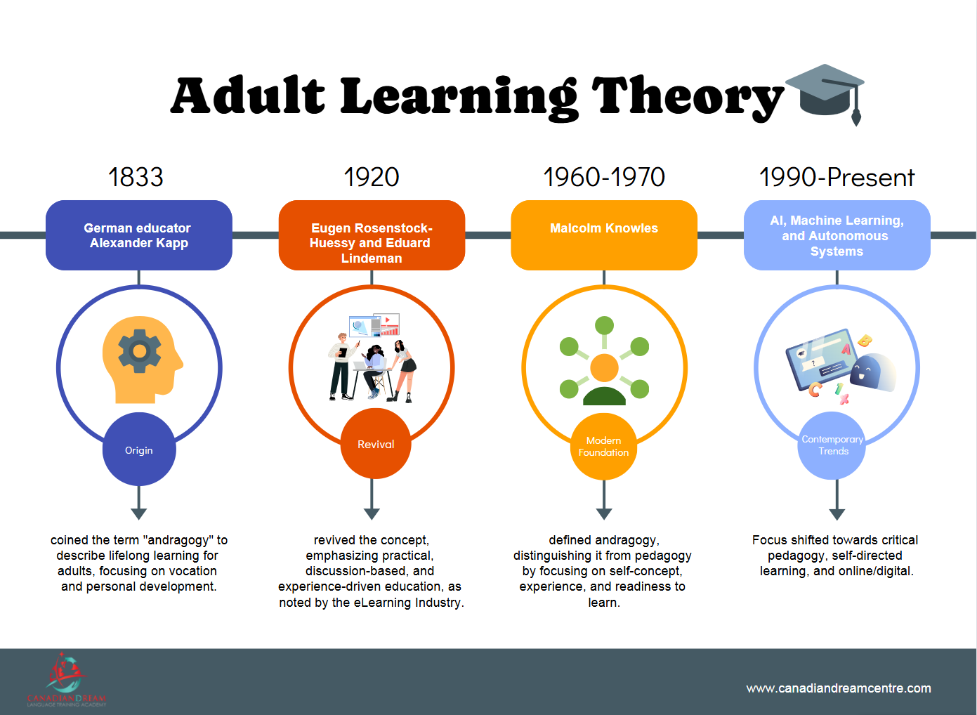 This infographic is used at the beginning of the Andragogy course to facilitate the chronological development of the theory.